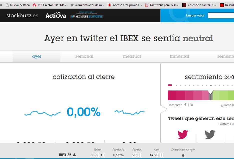 José Antonio Gallego, Responsable de Open Innovation del CIBBVA, nos presentó la fantástica herramienta Stockbuzz.es, que recoge la información que se publica en Twitter sobre bolsa e IBEX 35 para averiguar las tendencias del mercado. Stockbuzz filtra y pondera los mensajes que se publican para mostrar si se valora de forma positiva o negativa un valor concreto. Uno de los factores que Stockbuzz tiene en cuenta para realizar su análisis es la importancia y credibilidad del emisor. Esta herramienta incluye información en tiempo real sobre la evolución del IBEX, lo que la convierte en un instrumento verdaderamente útil para seguir la evolución del mercado de valores.